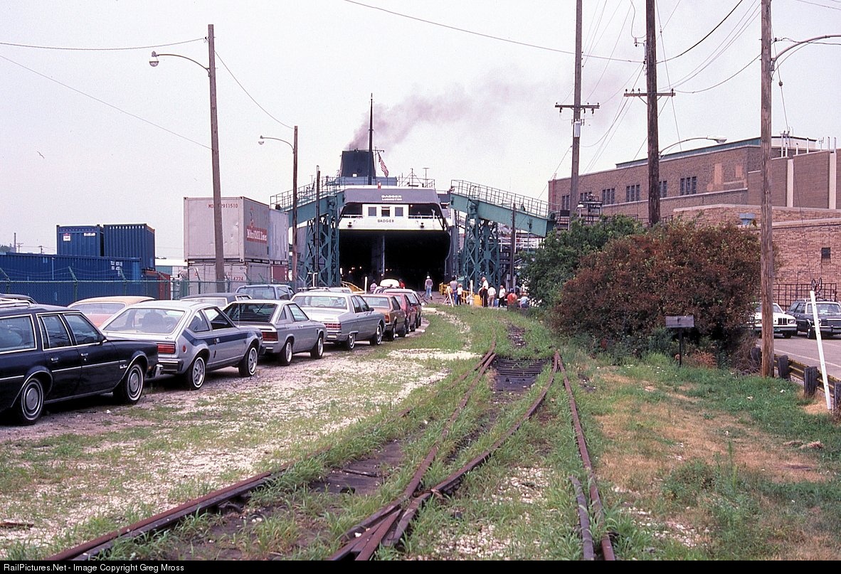 Where's the train? The tracks are still in but the C&O no longer serves the carferry in Milwaukee, WI. The lower level now hold autos, not freight cars. There were 3 car ferries that carried RR freight in Milwaukee at one time, PM, GT, and C&O, but all freight traffic is gone at this time. Remarkably, the steam powered Badger carferry lives on and still crosses Lake Michigan.