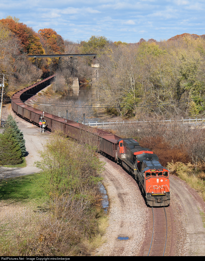 A first time for CN GE power on the Bessemer, a southbound loaded ore train departs the harbor in Conneaut.