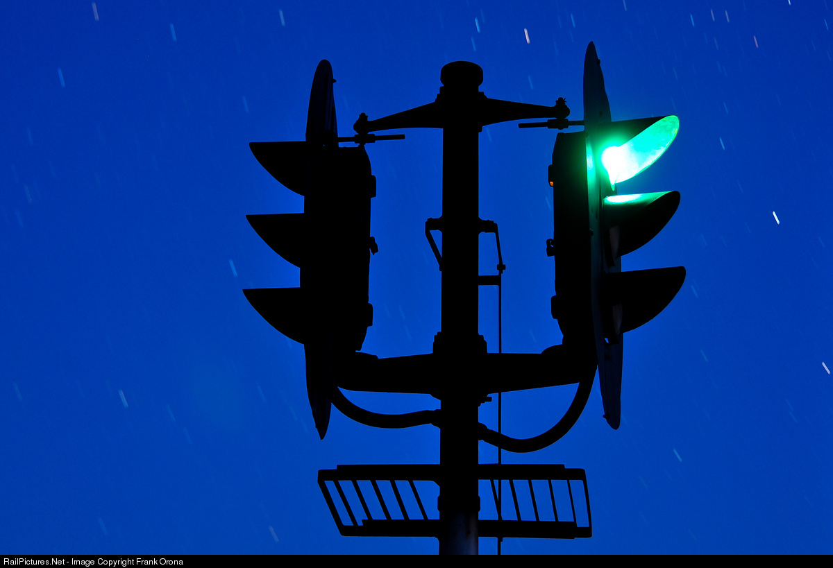 The blue hour begins to envelope the sky as the South End Cusseta signal continues to display its "clear" green light. This Absolute Block Signal is telling any southbound train that there is no oncoming traffic between here and the next meeting place at the North End of Opelika siding, which is exactly 11 miles away.