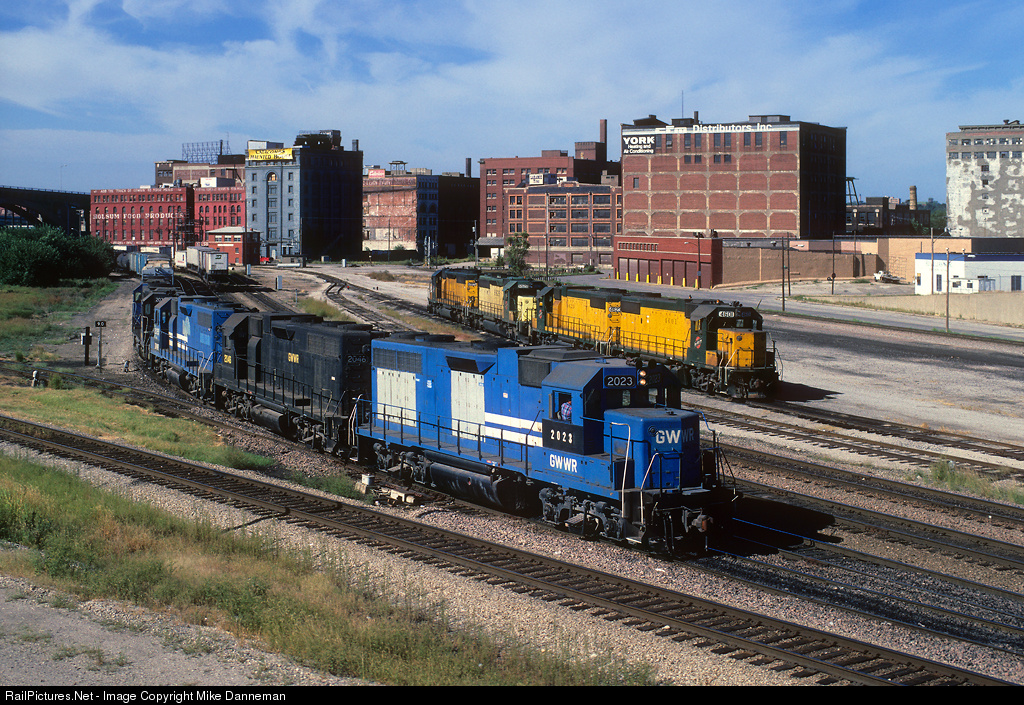 An eastbound Gateway Western Railway freight approaches West Bottoms in Kansas City, Missouri, on September 16, 1990. The train is passing some idle Chicago and North Western locomotives, and has just met a Burlington Northern intermodal, the rear passing the Old Union Depot Interlocking tower in the background. GWWR No. 2023 is former Penn Central/Conrail EMD GP38 No. 7762. With Santa Fe backing, the Gateway Western Railway was formed in 1989 (beginning operations in January, 1990) by purchasing the former Alton route between Kansas City and St. Louis from bankrupt Chicago, Missouri and Western. This gave Santa Fe access to St. Louis, which after the BNSF merger in 1995, became redundant. In 1997, GWWR was purchased by Kansas City Southern and operated as a subsidiary until 2001.