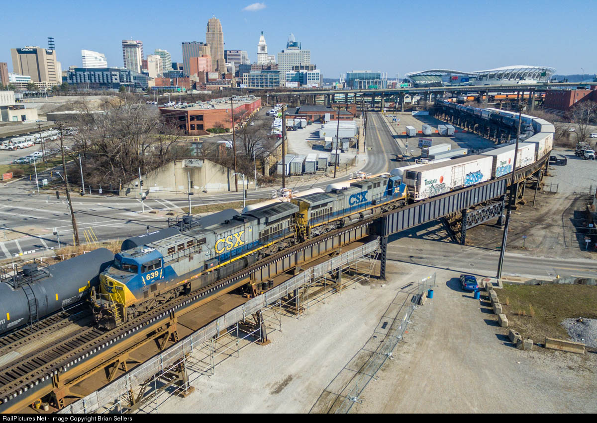 | CSX Q042 creeps north across the elevated approach to the Ohio River Bridge with the Cincinnati skyline in the distance. This is the second to last Q042 to traverse the CC sub via Corbin, Kentucky. Starting on Tuesday, February 7th, this train and its counterpart Q041 will start running via the LCL subdivision to Louisville and then south to Tennessee. This routing will allow for double stacks as clearances only allow for single stacks on the CC sub. Speeds on the route to Corbin are a also likely to be reduced soon as CSX has not identified it as part of its primary network. |