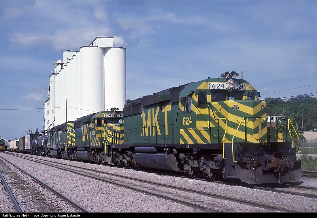 | MKT SD40-2 numbers 624, 634 and 606 at Kansas City, Missouri May 29, 1983 An original Kodachrome slide from my collection. |
