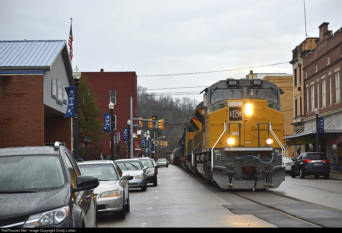 Just after a hard rainfall, Q316-05 heads west to Grafton through the streets of St. Mary's, WV with two EMD Tier 4 demonstrators on the point.