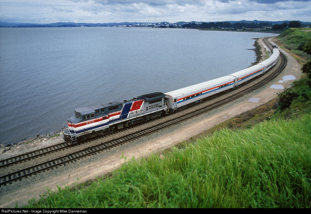 A westbound Amtrak Capitol curves along San Pablo Bay at Pinole, California, on March 12, 1995. The train is led by GE P32BWH “Pepsi Can” No. 500, with another P32 is on the east end of five Horizon cars.
