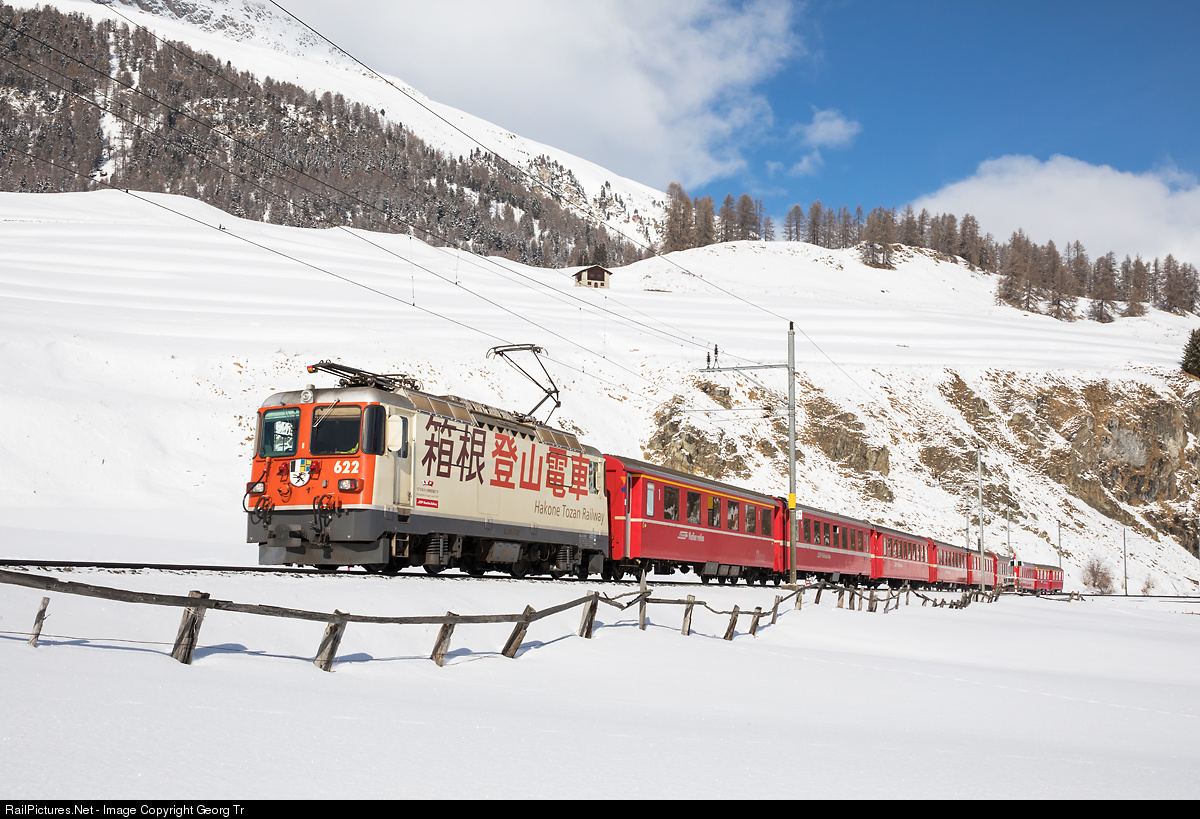 Ge 4/4 II # 622 with publicity paint scheme for "Hakone Tozan Railway" in Japan is pulling the RegioExpress 1327 from Landquart via Klosters-Vereina-Zernez to St.Moritz near Celerina. The last car is oldtimer first class A # 1251, which was built in 1939 and still in regular service!