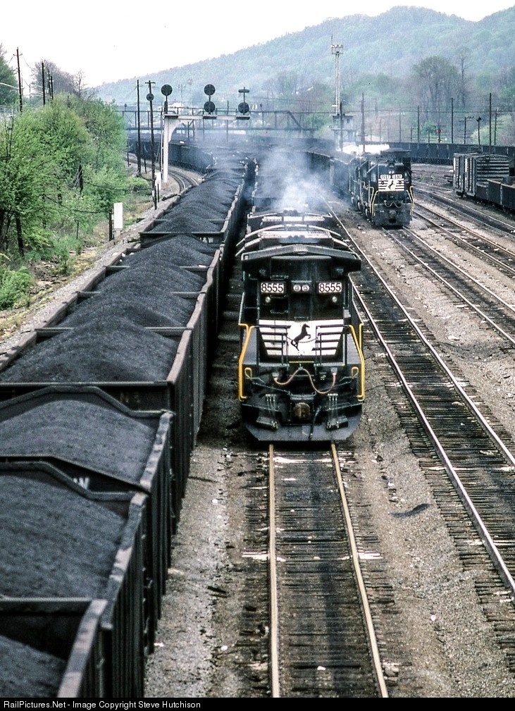 | Year old GE C39-8, 8555, is departing Bluefield yard for points east. Two additional loaded coal trains are awaiting their turn. Bluefield was a busy place back in 1985. Not so much nowadays. |