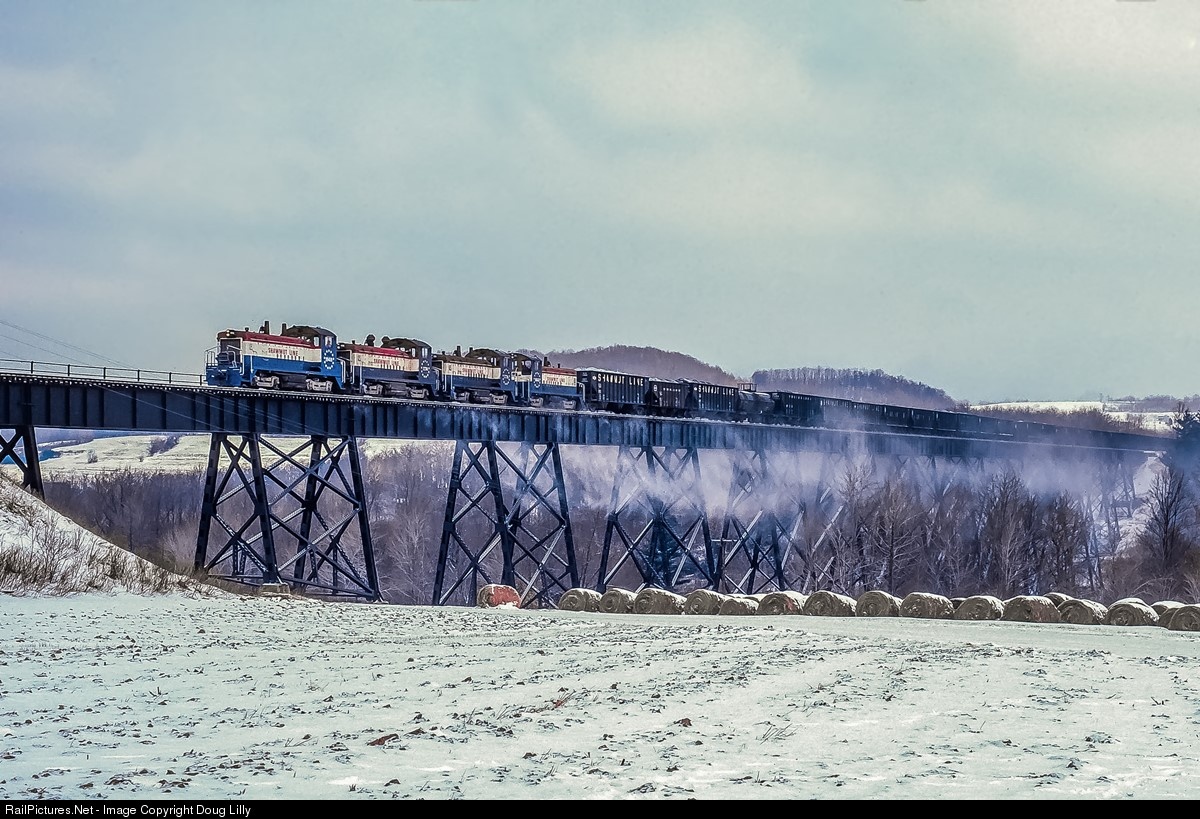 | After an overnight dusting of snow, the Pittsburg & Shawmut’s turn from Brookville shakes the thin layer of powder off the deck of the 1430-foot Sprankle Mills trestle. Four SW9’s and a long train indicate that business is good in this 1982 view. The fortunes of the coal industry along the line would soon begin to change, and this section of the P&S main would be ripped up and rail-banked. The trestle still stands, but it is highly unlikely that the rails will ever be replaced. |