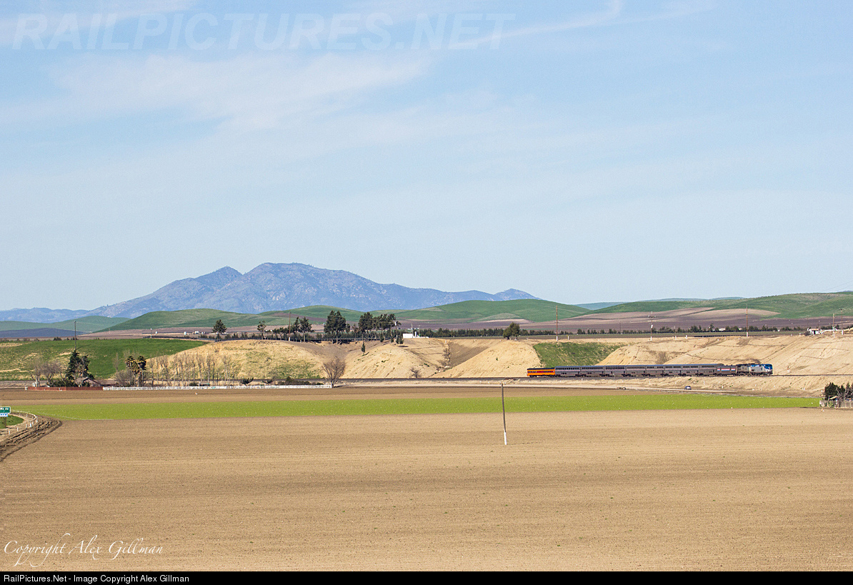 | With both units smoking off in the distance, Amtrak 11 begins to slant upwards as it works upgrade off the valley floor and onto the hillside just south of King City. Bringing up the markers today is the Los Angeles-based private car "Montana" heading home after spending a night in Oakland. |