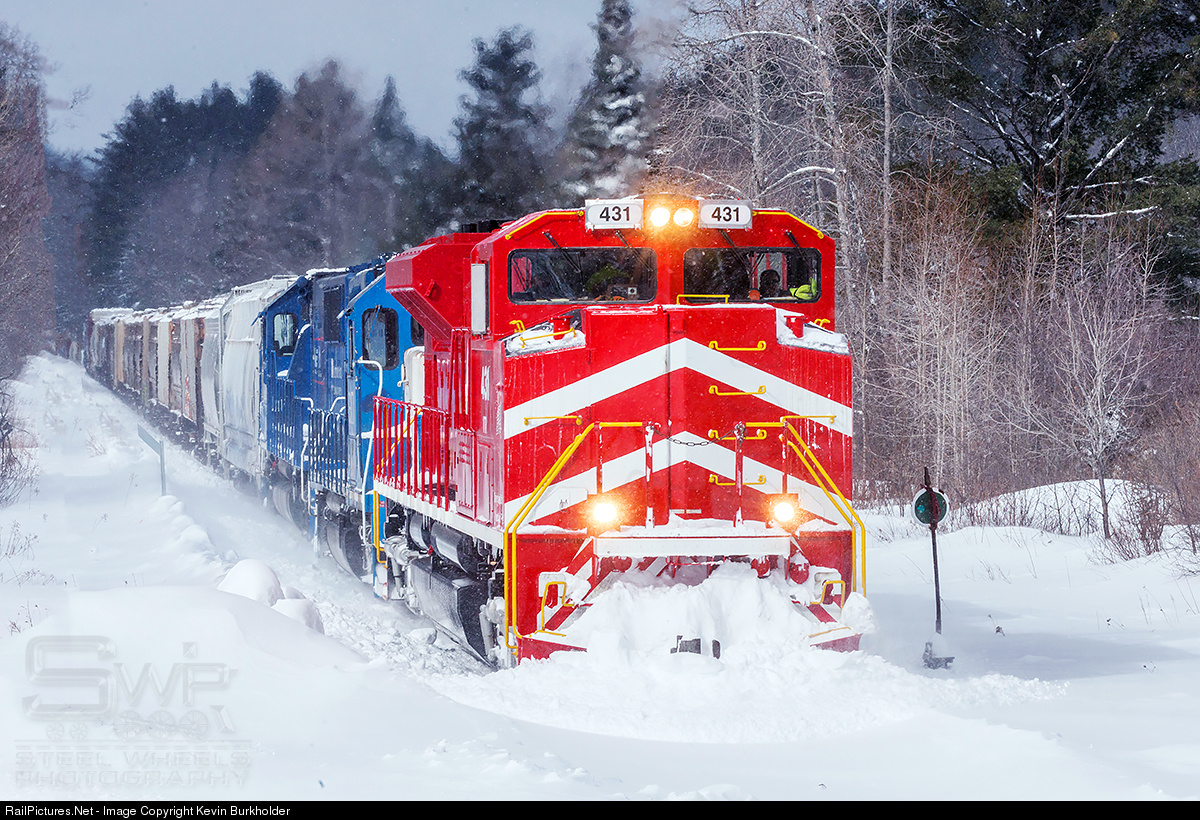 | Green Mountain Railroad train #263 is seen climbing to the top of the Green Mountain summit near Mt. Holly, Vermont on February 13. The snow was still falling as the sun began making its break on the eastern slope of the Greens. Train was led by VTR SD70M-2 431, GMTX GP38-2 2684 and GMTX SD60 9000. |