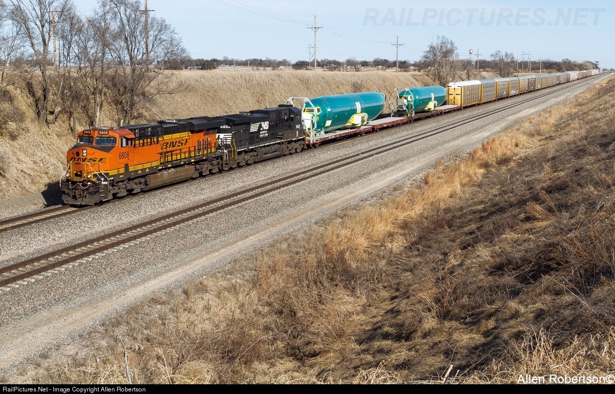 BNSF 6808 & NS 8822 lead a short westbound consisting of two Boeing fuselages and a string of auto racks.
