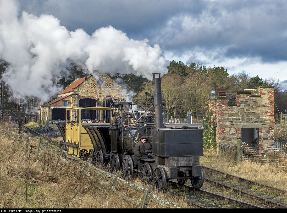 Replica locomotive Puffing Billy takes visitors for a short ride on Beamish waggonway. Designed to illustrate train travel in 1825. The original Puffing Billy was built in 1813 for transporting coal in the Tyneside mines and the locomotive still exists though not in a working condition
