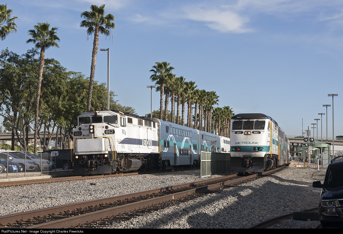 | Metrolink 155 to Chatsworth and 116 from Moorpark make their station stops at Burbank, showing off the two general varieties of F59s that Metrolink uses. |