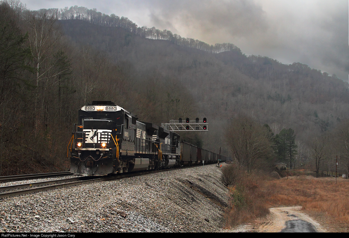 This is the climb for Raitt tunnel, also known as the Home Creek Grade. This ex. N&W branch lies deep in the heart of Central Appalachian Coal Country. NS8880 built in 1995 leads the charge up the 1.7-1.8% climb at Lynn Camp, Virginia. Stormy weather and fog add to the drama as this coal train climbs one of the steepest grades in the east... the long coal drag had 3 big AC pushers on the rear...What a show!...