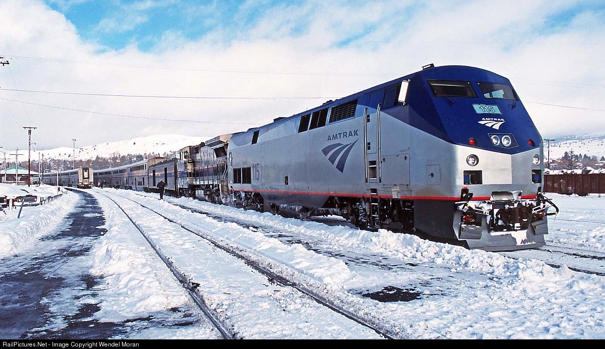 They say if you hang out long enough around the railroad you'll see just about anything. On the first weekend of 2004, the Coast Starlights met at the depot in Klamath Falls, Oregon. On the left, No. 14 is departing about two hours late. It had to wait for a crew to arrive on a Horizon Air flight from Portland. On the right, No. 11 has just arrived, nearly 12 hours late. The delay was due to a severe winter storm in the Cascades.