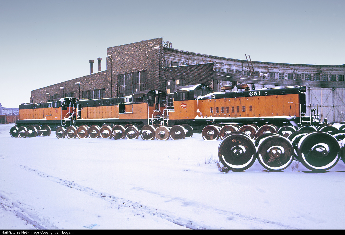 MILW 651, an SW1200 built in November 1954 cools off outside the Pigs Eye Yard next to the roundhouse. The unit will serve MILW for 12 more years, being retired in February 1985. Next to 651, Baldwin DS-4-4-10 933, built in October 1948, will not turn a wheel in service again. It was retired a month after this photo in February 1973. MILW 911, a Baldwin S-12 was built in December 1953 and survived until February 1976.