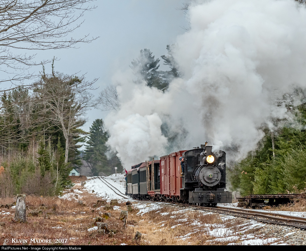 The 7-car demonstration train seen here headed north at about MP 6.5, in a location known as Albee's Field. The tiny Alna Center Station is in the background behind the train. The consist is headed up by Monson Railroad Locomotive #3 from the Maine Narrow Gauge Railroad Museum in Portland, with Engineman Bill Piche on the throttle. Pushing from the rear is WW&F Locomotive #9, with Engineman Rick Sisson in control.