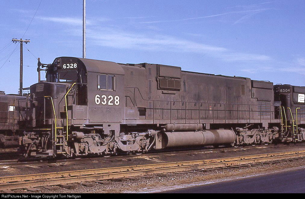 Penn Central's black dip paint scheme is generally not remembered with fondness, but lots of classic locomotives wore it. Minimally decorated Century 630 6328, an ex-PRR unit, visited Boston in April 1971.