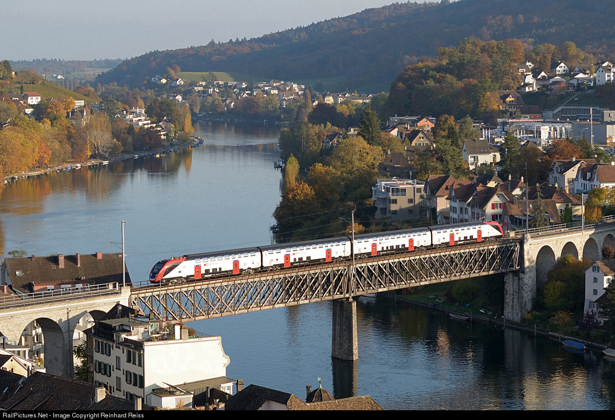 | The Bombardier double deck Intercity train passes Bridge over Rhine on the way from Etzwilen to Schaffhausen after a day of test runs. |