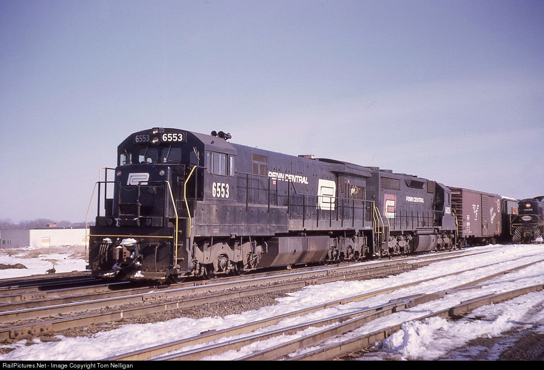 Penn Central's U33Cs were the first locomotives to be delivered from the factory in PC black, ordered by the PRR but arriving during PC's first month. On a winter afternoon, one-year-old 6553 and an SD35 mate prepared to depart the West Springfield, MA, yard for a westbound run over the Berkshires on the former Boston & Albany line.