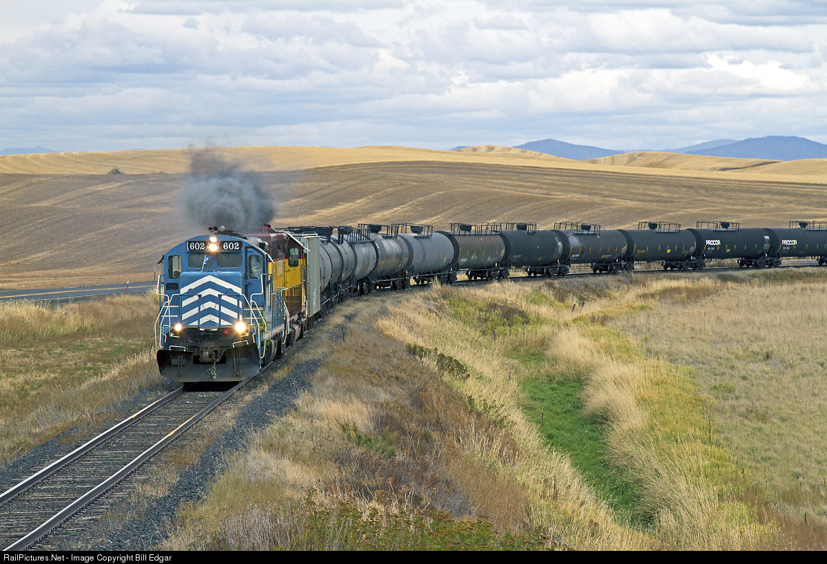 A nice little puff of smoke indicates a notch up on the throttle as the northbound Washington & Idaho "unit LPG" train deals with undulating grades and curves north of Oaksdale, WA, September 19, 2016. The train had taken cars south to Belmont for storage, picking up this group and heading north to an eventual interchange with BNSF at Marshall, WA.