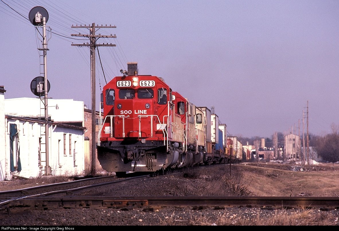 SOO 6623 is about to hammer the MILW diamond in Burlington, WI in March of 1985. The diamond is gone today, but the line is now an important part of the Canadian National.