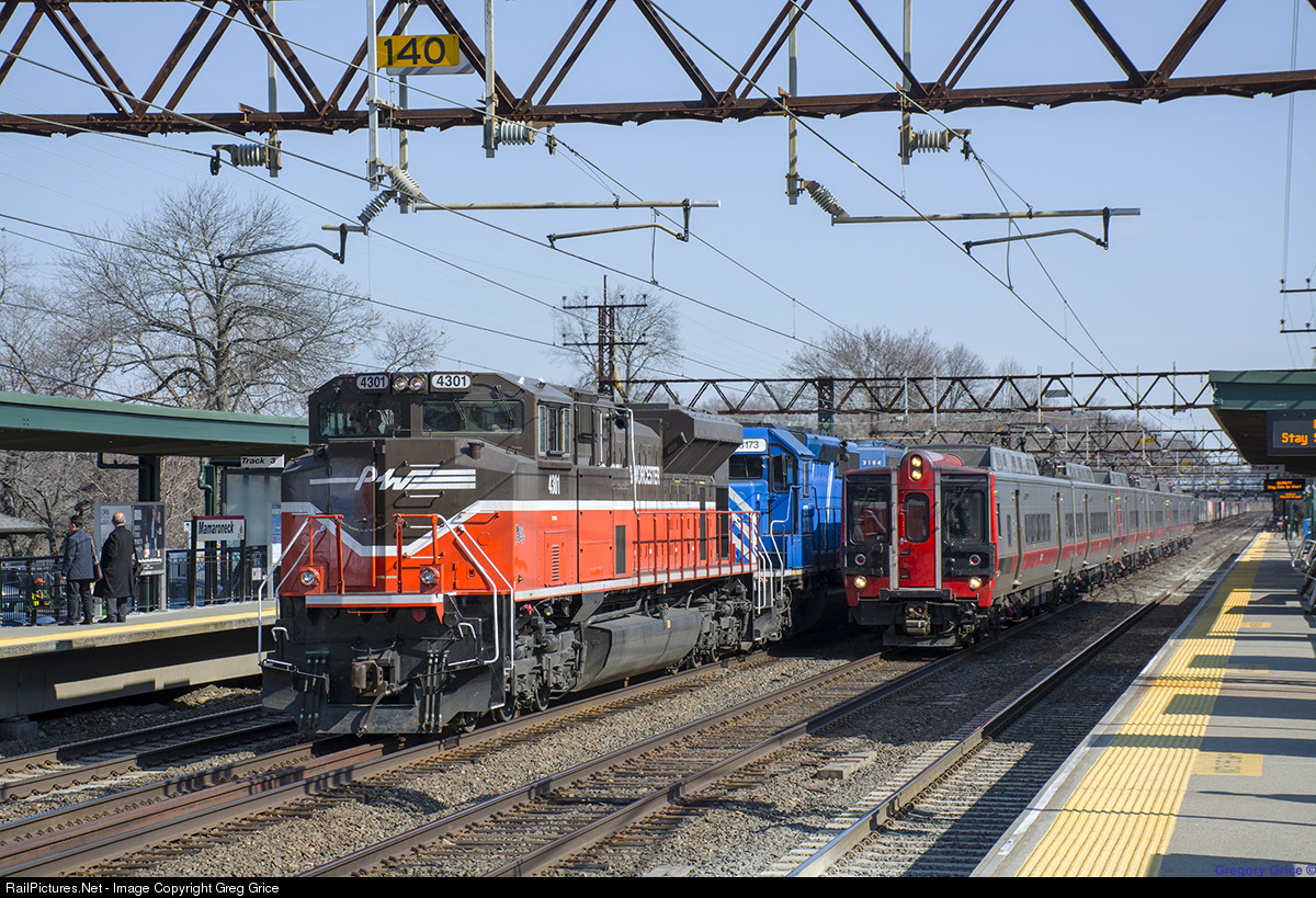 | "M8 Meets M-2 at Mamaroneck" A westbound New Haven Line Line train consisting of Kawasaki M8 railcars passes by outlawed Providence & Worcestor "CHFP" with EMD SD70M-2 4301 in the lead at Metro North's Mamaroneck Station. 4301 is one of two EMD SD70M-2's purchased by P&W from the FEC Railroad and modified to run on the Northeast Corridor. |