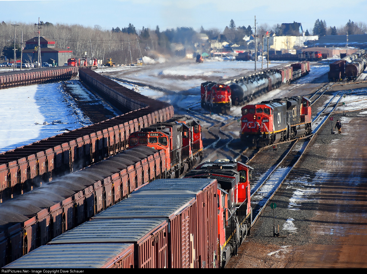 | A busy afternoon at Proctor yard near Duluth. In the upper left in front of the yard office is the power off a pellet load that just arrived and is heading to the house for servicing. In the upper right is a locomotive set moving from the house for an empty limestone train that will be run to Duluth and spotted at Hallett Dock. In the center is U-715 on limestone loads ready to depart for Minntac. Center right is the 12:01 "Extra Switch" using road power. In the lower right is L-511 with a transfer from Pokegama Yard and in the center is the 1400 Proctor Roadswitch crew with a loaded ore train off the scale track preparing to "thread the needle" to Ore Dock 6. |