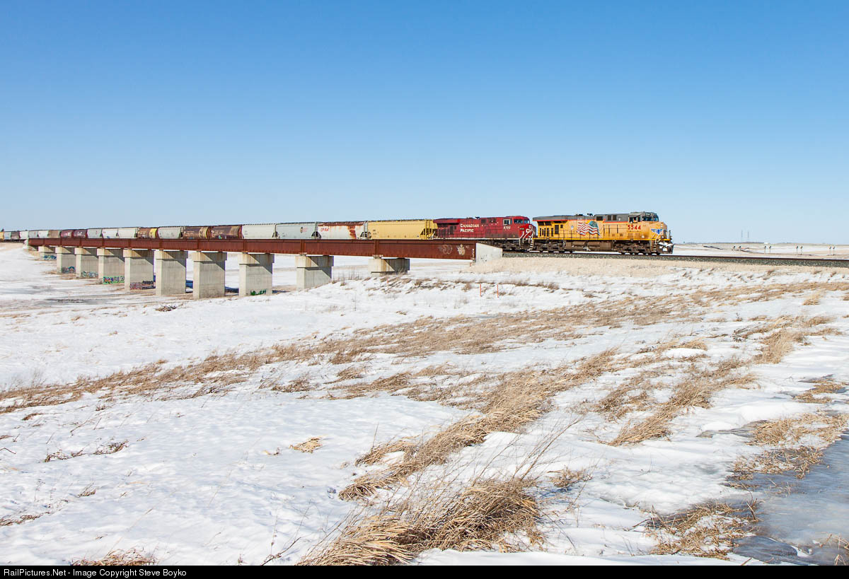 A foreigner was leading today! A grubby Union Pacific locomotive was doing the honours for a CP grain train heading south out of Winnipeg. They were crossing the Winnipeg Floodway en route to the siding at Grande Pointe just south of the bridge. The Floodway diverts the Red River around Winnipeg in the spring and may well get used soon, once this snow melts.