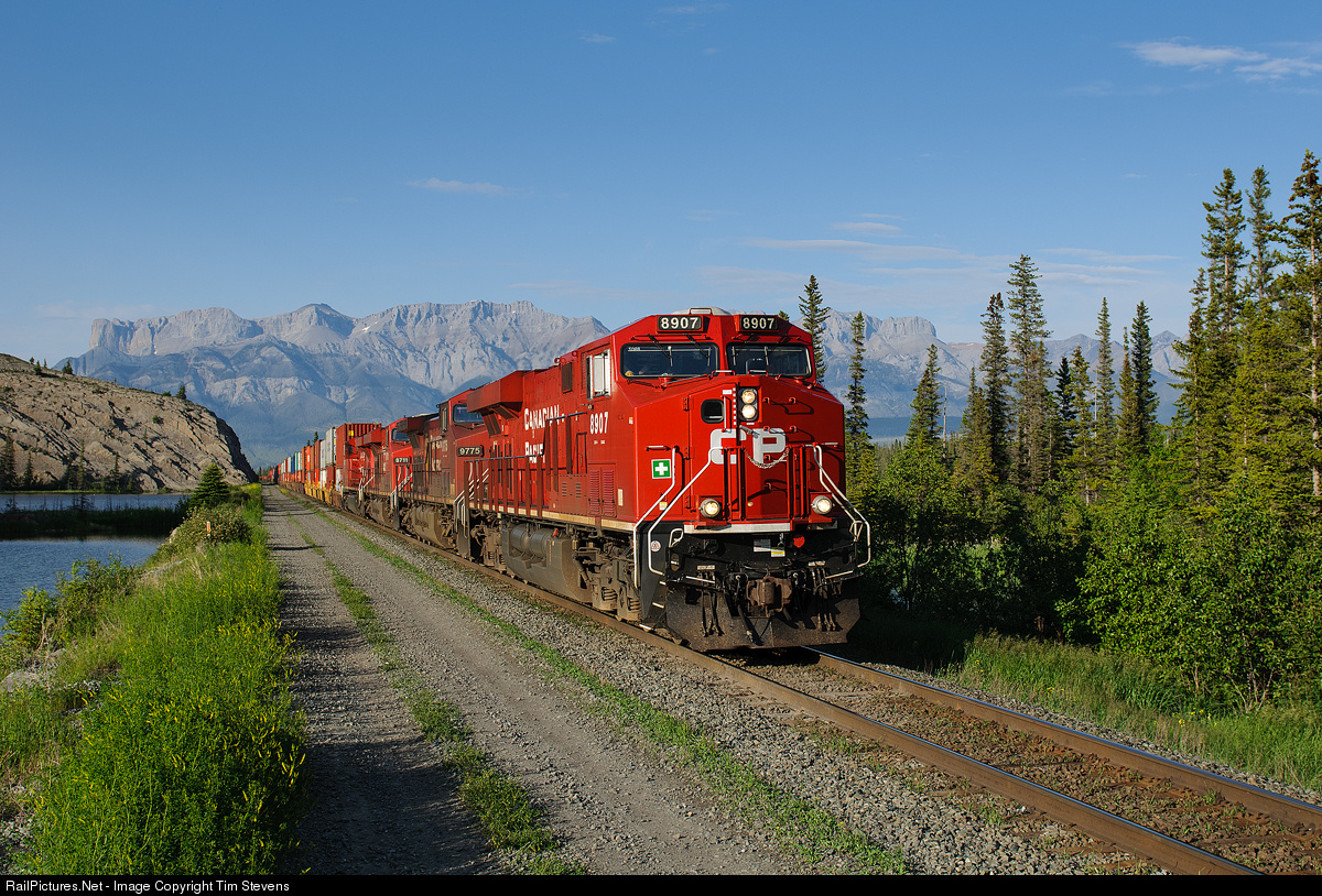 Detouring due to severe washouts on CP's Laggan Subdivsion in central Alberta, CP Train 101-17 (running as CN train F40151 21 between East Edmonton, AB and Coho, BC) speeds west on the most scenic part of CN's Edson Subdivision. The train consisted of CP ES44AC 8907, AC4400CW 9775, ES44ACs 8711 and 8755 on the headend, followed by 93 intermodal platforms, AC4400CW 9683 mid-train with another 43 intermodal platforms behind that.