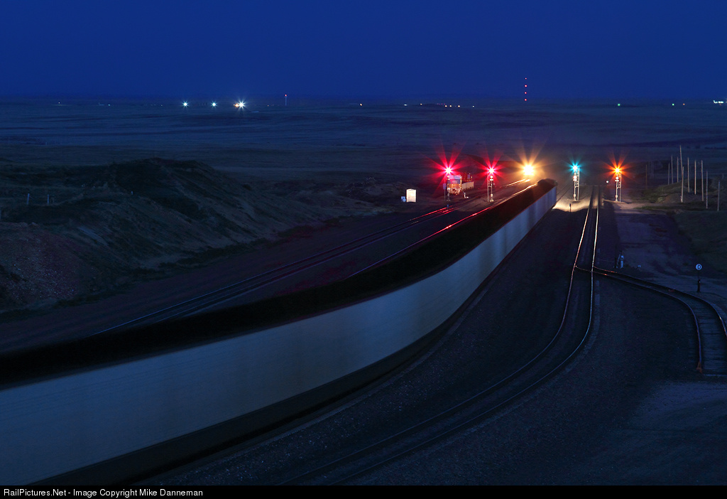 The blue hour has descended over Logan Hill in Wyoming’s Powder River Basin on July 2, 2016. Two Union Pacific coal loads have crested the hill, with the one in the foreground about to knock down a green block, while the DPU of the first one is about to disappear around the far curve. The lights of “greater metropolitan” Bill, Wyoming, are on the horizon.