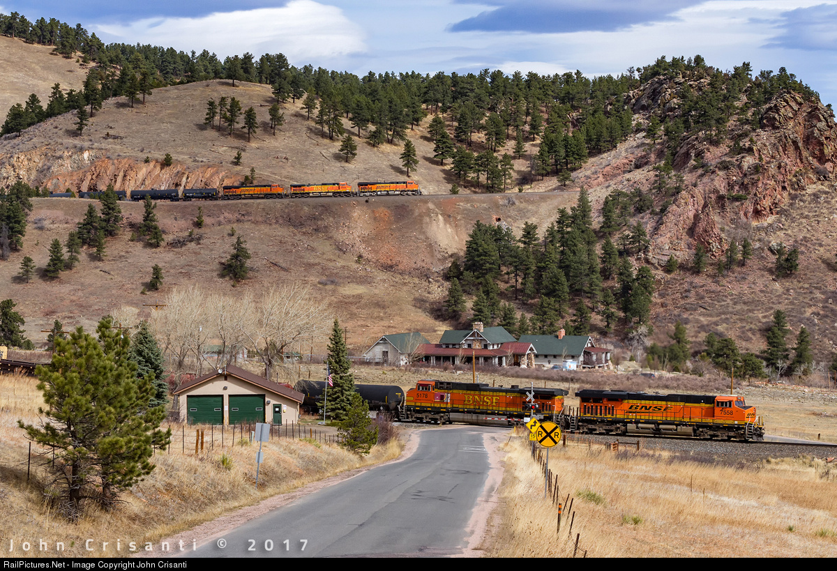 Five BNSF GEs take charge on the westbound Denver, Colorado to Provo, Utah trackage rights manifest as it climbs the 2-percent grade in Coal Creek Canyon at Blue Mountain Road on March 14, 2017. The head end is about to enter Tunnel 1 while the two DPUs are about to clear the crossing.