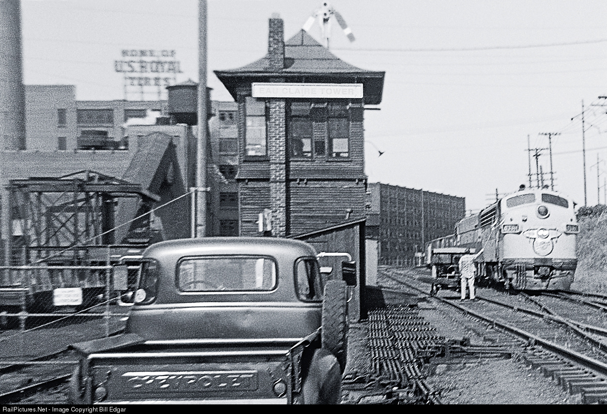 This vintage shot was taken at Eau Claire Tower, capturing a classic piece of railroad history from the 1950s and 60s. The tower operator hands up orders to the engineer of train 172, powered by an F7 ABA consist. The rear units still in the green/yellow/black scheme. Note the piping for the lever controls and the vintage Chevy. I was 13 and this was one of my first shots of CNW. Train 172 was one of the last trains through Eau Claire that still regularly used F units in the summer of 1964.