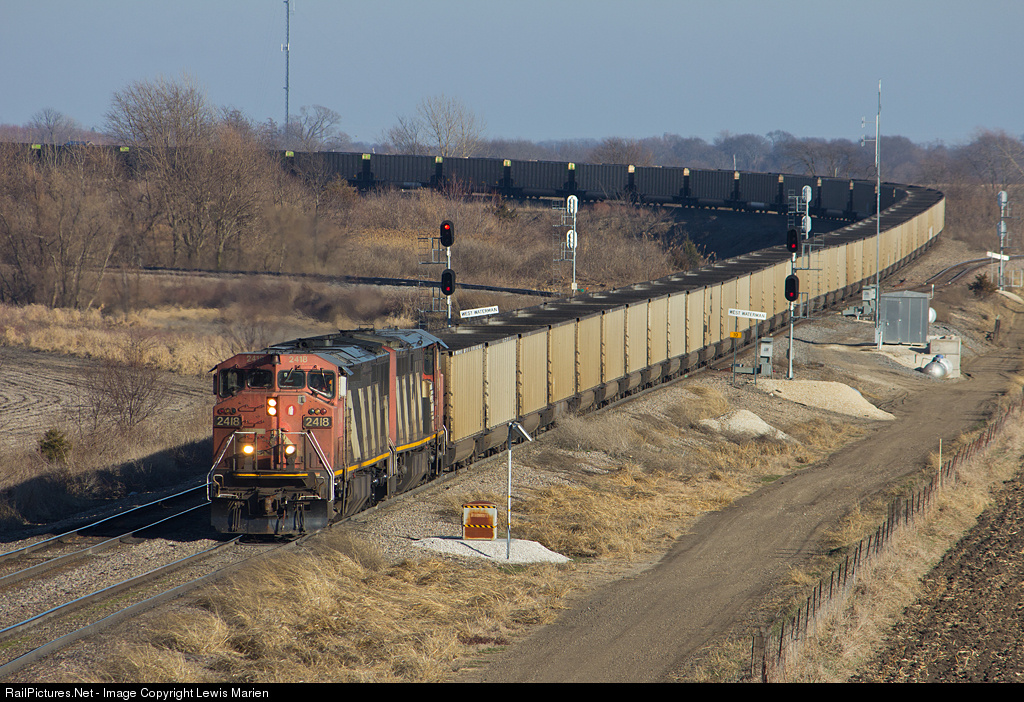 | Led by a pair of Canadian National C40-8Ms with matching "zebra stripes," coal empties from a Michigan power plant for the Black Thunder Coal Mine in Wyoming are coming off the "Quincy Main" (Brookfield Subdivision) and heading for the Ottumwa Subdivision via the Graham Cutoff near the south end of the large classification yard in Galesburg on February 22, 2017. |