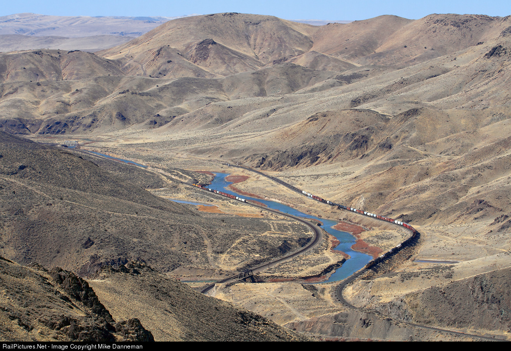In desolate Palisade Canyon, a Union Pacific local traveling west on Track 1 passes an eastbound freight on Track 2 with the Humbolt River separating them west of Palisade, Nevada, on March 7, 2012.