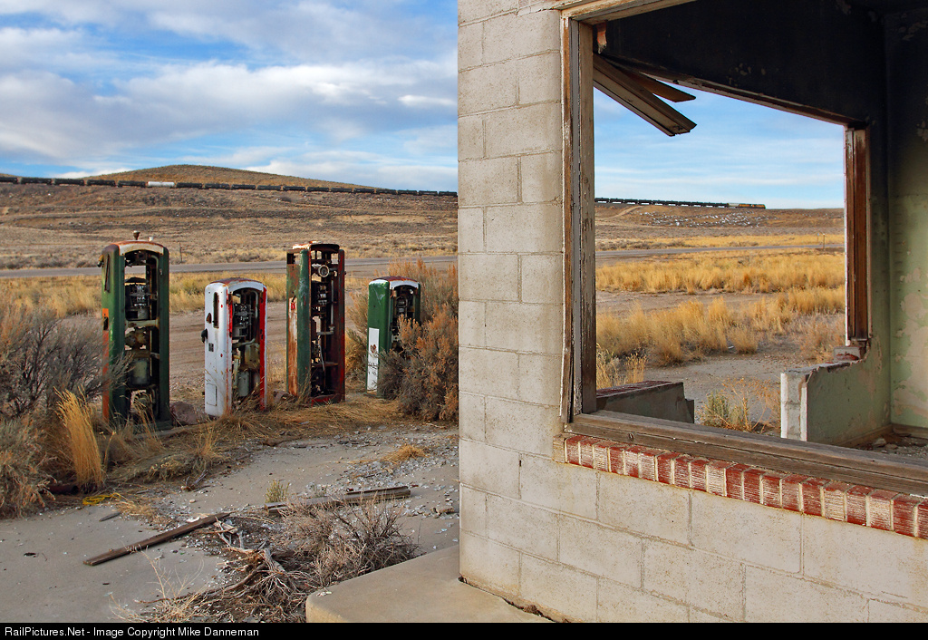 Through empty windows of an abandoned Sinclair gas station along old U.S. 30 through James Town near Green River, Wyoming, is a most apropos sight of a westbound Union Pacific oil train climbing Peru Hill on the morning of March 13, 2012.