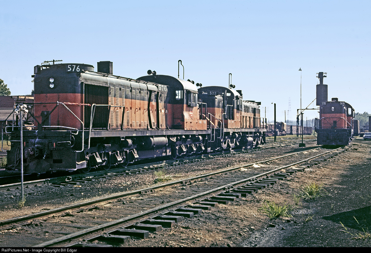 Milwaukee 576, an RSC-2 rebuilt into a low nose RSC-2.5 or 2M, shows off its damage at La Crosse, WI in July 1972. The unit was damaged on its train as it passed by Eau Claire Sand & Gravel after being hit by an end loader. The damage was mostly cosmetic, and the unit survived until April 1976 along with sister 578 on the right. Both were scrapped in June 1976 by PNC. The RSD-5, no. 573 was retired in September 1973, but sold to another company for industrial use. RSD-5s could not be sent to Eau Claire due to bridge weight restrictions. RSCs had 4 powered axles, thus were lighter.