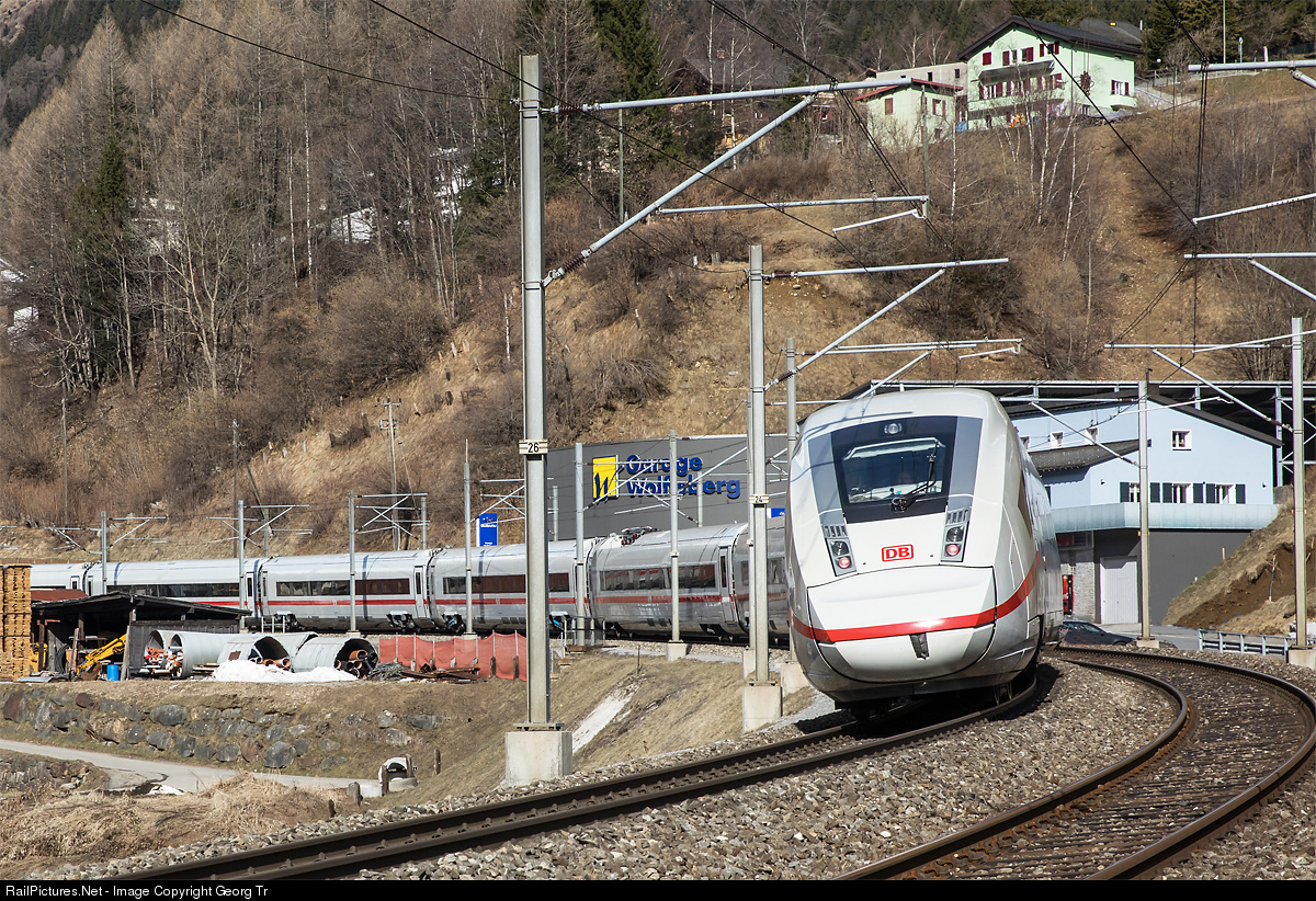 | The new german ICE 4 # 9004 is on running-gear technology testruns on the Gotthard mountain line, now called "Panoramastrecke". This day the train circulated several times between Airolo and Bodio on the south ramp. The 12 car train with 9900 kW and for 250 km/h is below Airolo in a 300 meter curve radius. |