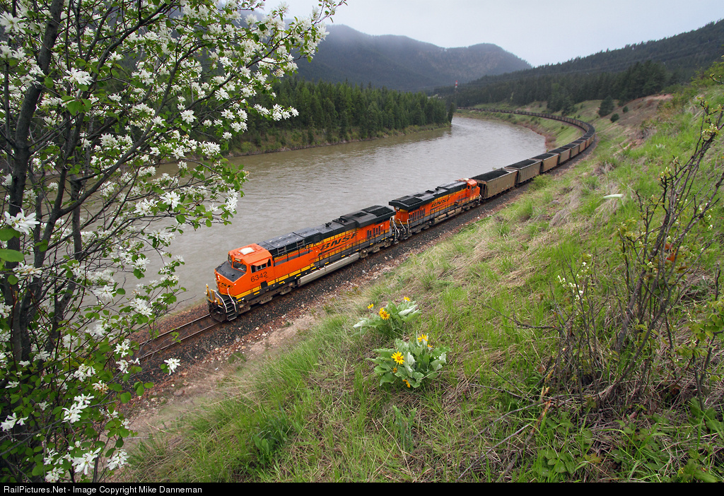 | Spring is making a showing along the banks of the Clark Fork just west of Toole, Montana, as a westbound BNSF coal train rumbles by on May 3, 2012. |