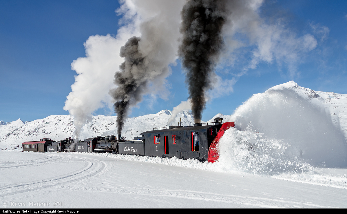 "Dispatch, the Rotary Fleet is at the summit." The radios crackle with Superintendent Hanousek's announcement that his rotary train is at the actual summit of White Pass (2,940 MSL) and is plowing north toward Fraser, BC. The snow is roughly 2-3 feet deep here and the rotary is handling it with ease. Photographers like myself, who are chasing it on snowshoes, are beginning to have a hard time keeping up. Despite the appearance of the surroundings, I am unzipping my jacket and taking off my gloves, because I am getting very warm. It won't be long before Superintendent Hanousek calls a temporary halt to the operation, to give the photographers a chance to rest, and his rotary crew a chance to bail out of the virtual sauna that is the cab of Old Number 1.