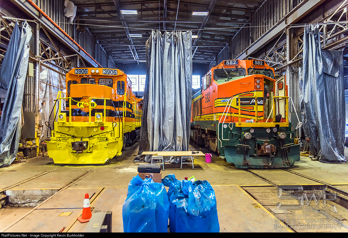 Genesee & Wyoming has begun the assimilation process with the Providence & Worcester Railroad through the planned painting of at least a dozen locomotives. Interesting to note, GWRR has applied new reporting marks to the Providence & Worcester fleet, in the form of PWRZ, to avoid conflict with Piedmont Western Railroad (PWRR). The first PWRZ unit to be repainted emerged from the paint shop today in St. Albans, Vermont, in the form of B39-8 #3906, while the PW 582 is being prepped for its turn for orange paint and will emerge as PWRZ 4007, then the SD70M-2s 4301 and 4302 should be following. Behind the SD70M-2s are B39-8s 3901, 3903, 3905, 3907, 3909, and B40-8s 4001, 4002, and 4003.