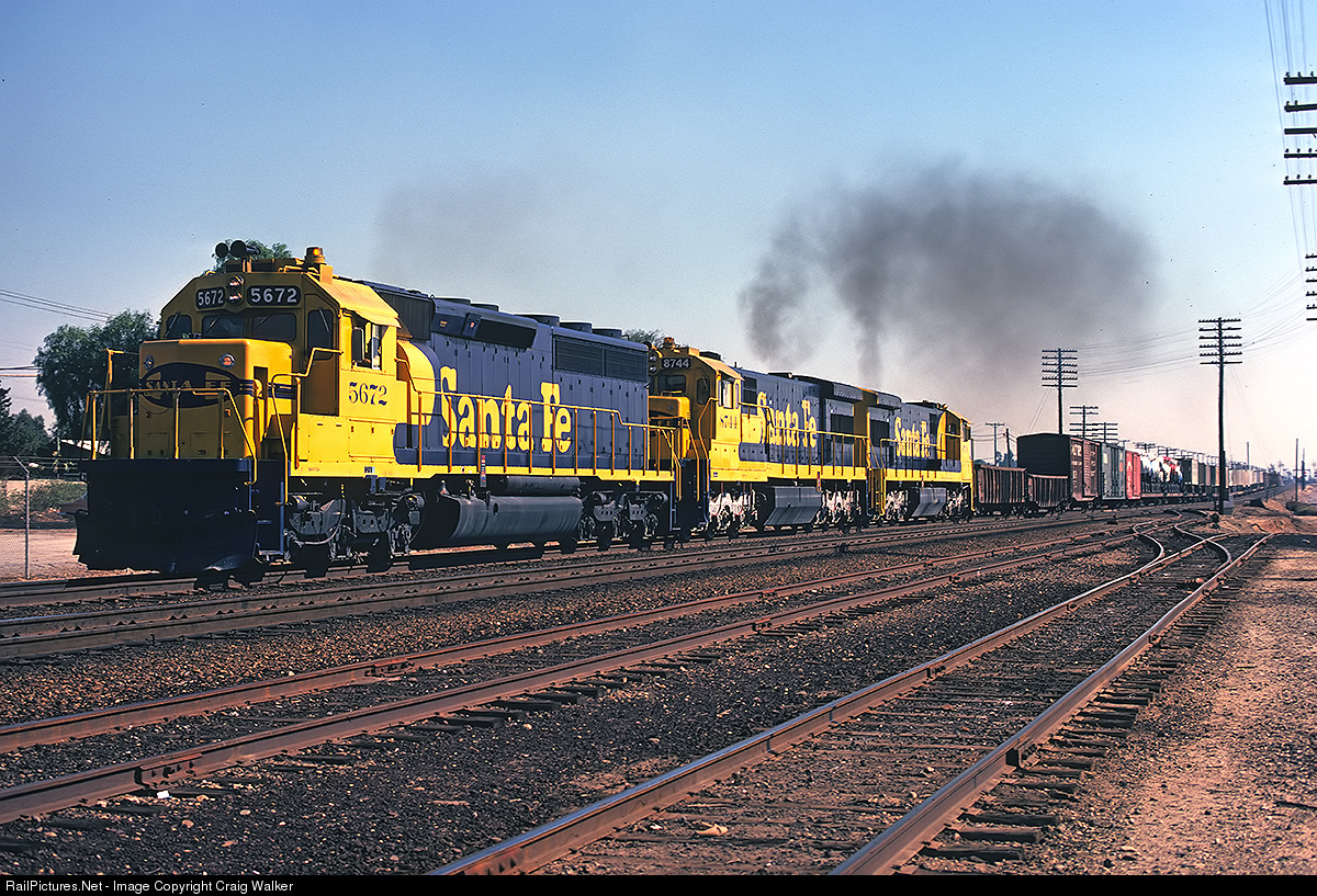 Heading west on Santa Fe's Third District is a short freight (not unusual on the Santa Fe in the 1970s) of primarily piggyback cars. Lead engine 5672 is an SD45-2 that was built in June 1973, and was one of the earlier engines delivered in the then-new Yellow Warbonnet paint scheme. This order was delivered before silver trucks became standard. A pair of U36Cs trail the SD45-2 as the train makes its way through La Mirada, California, on November 7, 1974.