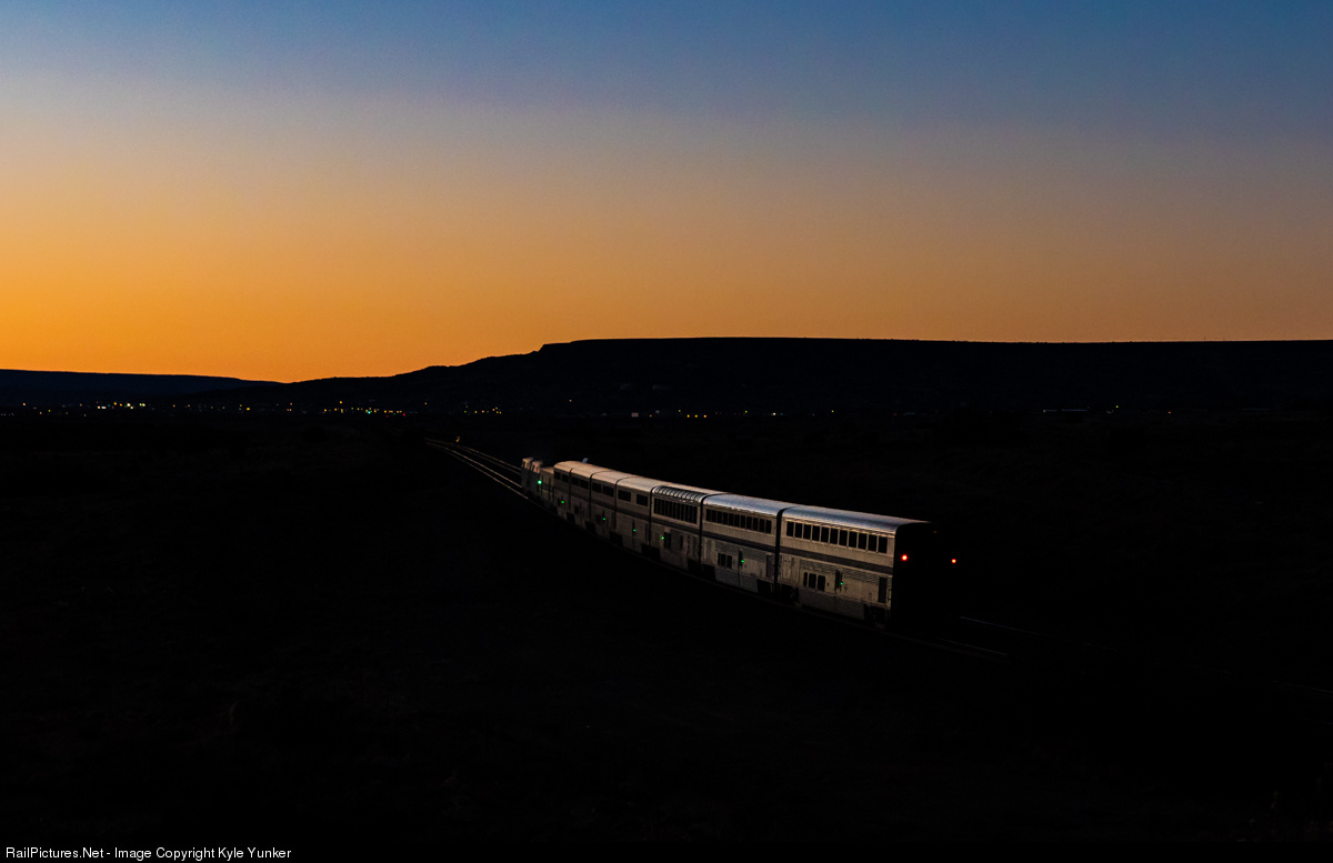 Amtrak's Southwest Chief sprints west along the ex ATSF transcon chasing the sunset at the end of another day in the desert.