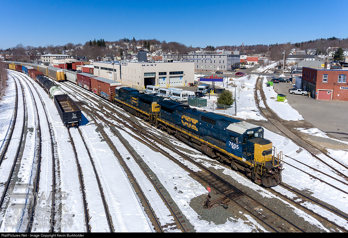 Pan Am Southern local train ED-8 is seen arriving at Gardner, Massachusetts on March 23, where they will set out a block of Norfolk Southern traffic for the Providence & Worcester Railroad interchange. The train is led by a pair of ex-CSXT MEC-lettered C40-8s, 7605 and 7552.