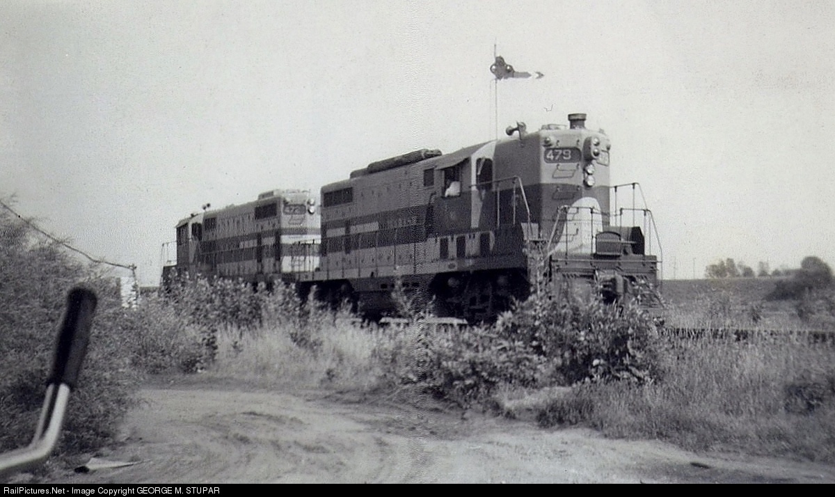 | One of my first rail pics ever taken, at age 14. The geeps have just set out their "mixed train" on the passing siding and are making a reverse move eastward on the main in order to pick up the combo (passenger, baggage, mail) car at the rear. The handlebar on my rail-fanning vehicle is obviously visible at left. |
