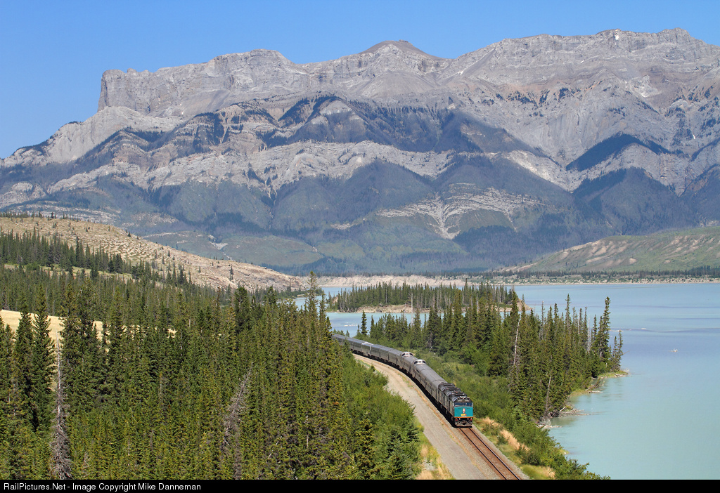With a massive mountain wall edging Jasper Lake in the background, VIA Rail train No. 1, the Canadian, cruises westbound out of Devona, Alberta, on July 11, 2014. Three EMD F40PH-3s power the stainless-steel streamliner toward the next station and service stop in the town of Jasper.