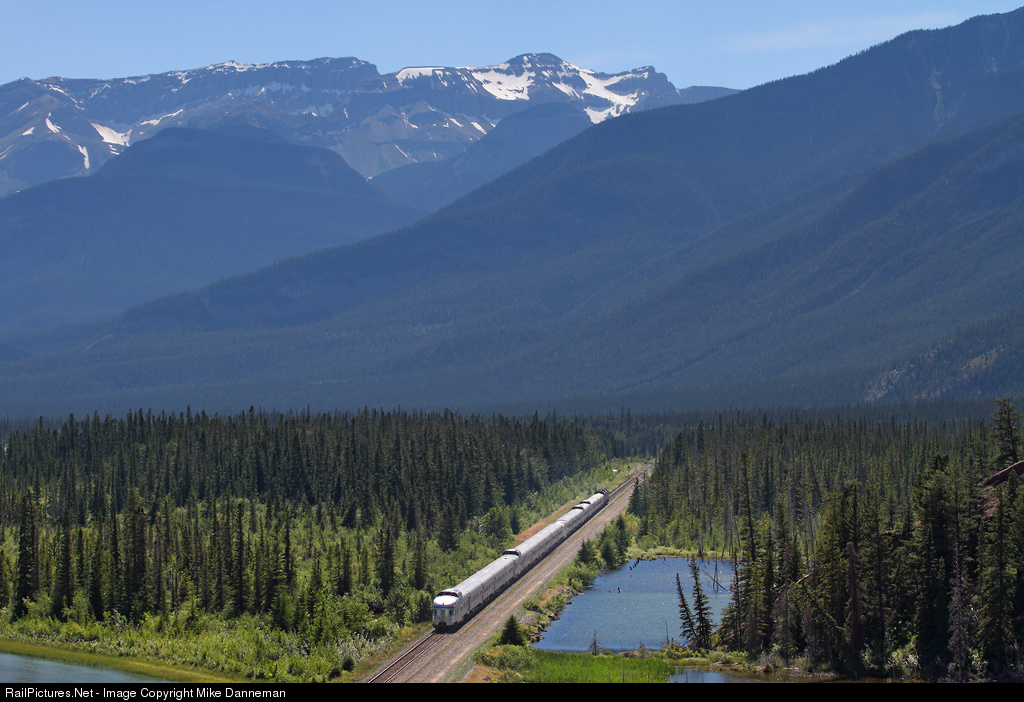 Surrounded by towering mountains, VIA Rail’s westbound “Canadian” is minimized by the scenery of Jasper National Park, even though the train powered by three F40PH-3s is 23 cars long! The streamliner will be stopping shortly in Jasper, Alberta, and is between Devona and Henry House in this view from Windy Point on July 11, 2014.