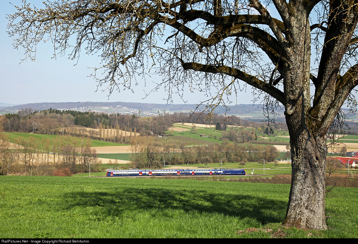 | A double deck commuter trainset (DPZ) S 9 service Uster - Zürich - Schaffhausen. The Swiss railway line Zürich - Schaffhausen leads 8.2 kilometers (5.1 miles) through the south territory of Germany. |
