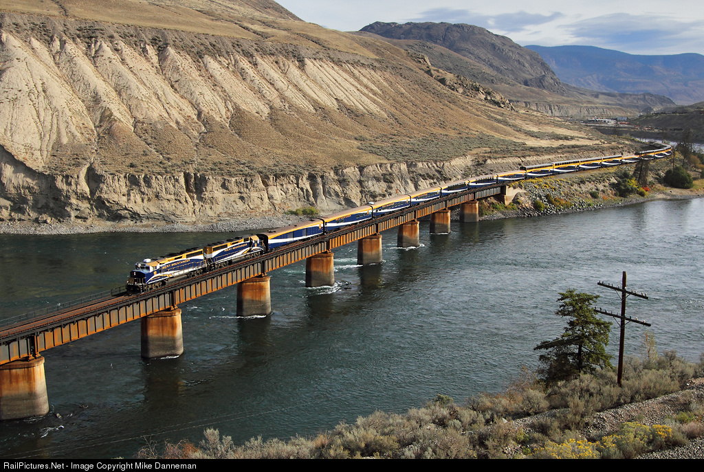 A westbound Rocky Mountaineer Railtours excursion train crosses the Thompson River Canyon on the Canadian National just east of Ashcroft, British Columbia, on September 24, 2015.