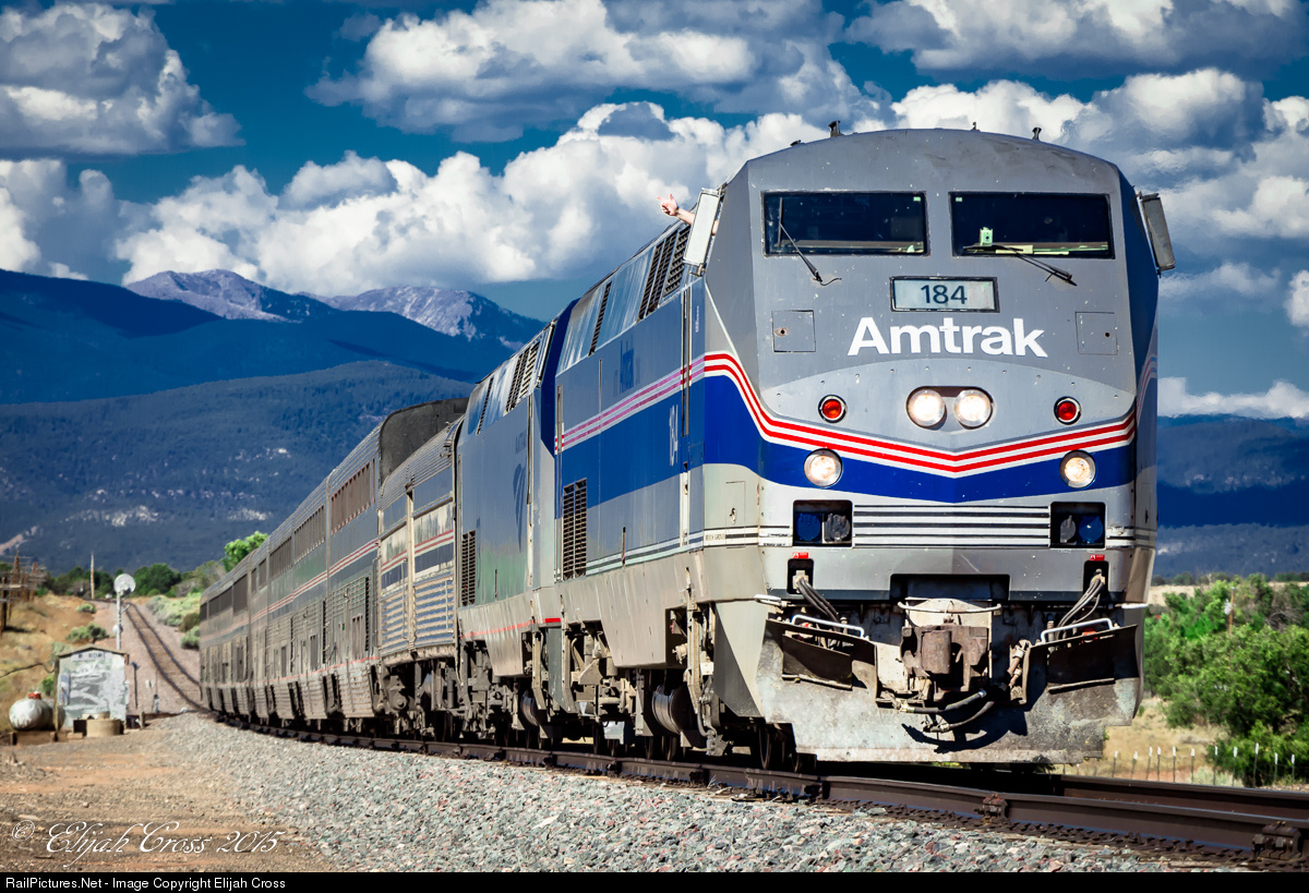 | Decorated in the Phase IV paint scheme, Heritage unit #184 leads Amtrak's eastbound Southwest Chief #4 through the picturesque community of Rowe, NM on a beautifully crisp Autumn afternoon. |