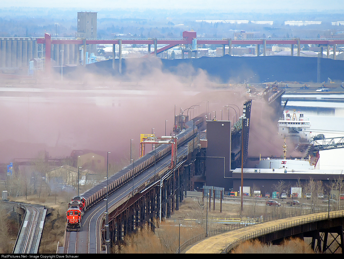 | A massive cloud of fugitive dust rises as an ore train dumps into the dock while the Canadian Steamship Line's vessel Rt. Hon. Paul J. Martin loads. CN does have a water deluge system on the approach to the dock to soak ore cars prior to dumping but it wasn't in use today. |